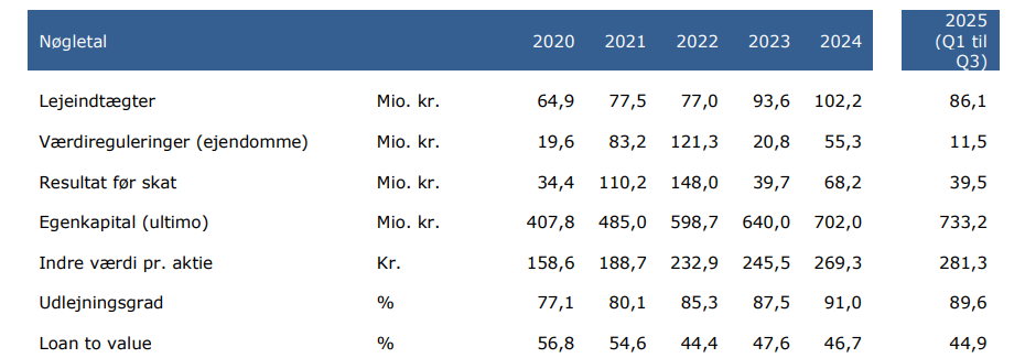 Et af Selskabets vigtigste nøgletal er indre værdi pr. aktie og dette nøgletal er steget fra 158,6 ultimo 2020 til 281,3 pr. 30. september 2025, svarende til en stigning på +77%. I samme tidsrum er